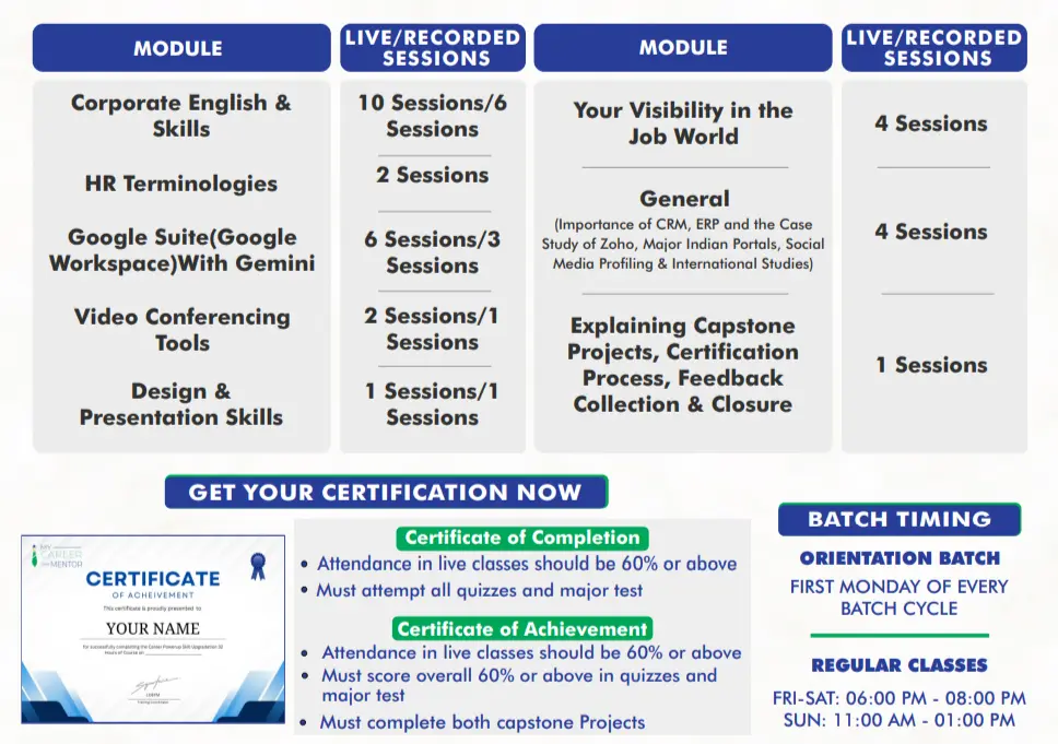 From sharpening your communication in Corporate English to Learning AI tools for day to day tasks, G-Suite (Google Workspace) knowledge enhancement, Common HR terminologies, LinkedIn profile optimization, CV building, and using job portals effectively, this program prepares you to navigate the early stages of your career with confidence.